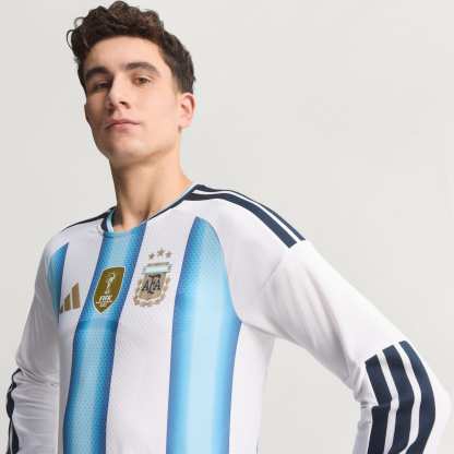 When it comes to soccer, heritage and innovation go hand in hand. The Argentina 26 Home Authentic Long Sleeve Jersey celebrates the World Champions and soccer DNA of Argentina. This jersey is a tribute to the team's legacy, inspired by those used in the three World Cup victories ('78, '86, '22). Complemented by matching shorts and socks, it proudly displays the Fed year of foundation as a sign-off. As the official game jersey that the players are wearing on the field, it comes complete with a heat-applied authentic label with hidden UV print to serve as a seal of authenticity. Designed for strong execution, it features Climacool+ technology. Superior engineering and advanced materials unite for a cool, dry, and distraction-free performance, helping you feel fresh and comfortable on the field, even during intense matches. Crafted with transfer-knit jacquard, this jersey offers a tailored, locked-in fit through body mapping. The special collar construction adds a touch of elegance, while the long sleeves provide extra coverage. With bold 3-Stripes and a seasonal collar showcasing its heritage, this authentic piece serves as a symbol of pride in excellence. With adithtdas, it's more than just clothing. It's a way of life.