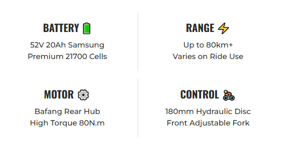 Unveiling the ACE-S Plus+, a high-performance, high octane variant of our ACE-S model that takes your riding experience to new heights. This upgraded version features front suspension forks, delivering a smoother ride across diverse terrains. Equipped with a High torque Bafang Rear Hub Motor, it boasts a higher capability, allowing you to conquer every trail with ease.