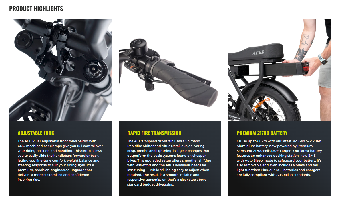 Loaded with premium features and celebrated year after year as Australia's favourite fat tyre bike the ACE range boasts a Shimano 7 Speed Derailleur, vibrant colour options and a cutting-edge battery system with our Latest GEN3 Aluminium Battery which encompasses 21700 cells that are 30% larger than our competitors, paired with a Smart BMS for optimal performance and safety.