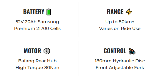 The ACE-X Plus+, a high-performance, high octane variant of our ACE-X model that takes your riding experience to new heights. This upgraded version features front suspension forks, delivering a smoother ride across diverse terrains. Equipped with a larger high torque Bafang Rear Hub Motor allowing you to conquer every trail with ease.