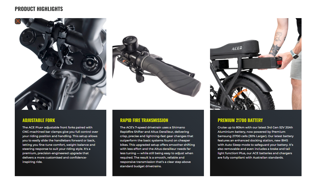 Loaded with premium features and celebrated year after year as Australia's favourite fat tyre bike the ACE range boasts a Shimano 7 Speed Derailleur, vibrant colour options and a cutting-edge battery system with our Latest GEN3 Aluminium Battery which encompasses 21700 cells that are 30% larger than our competitors, paired with a Smart BMS for optimal performance and safety.
