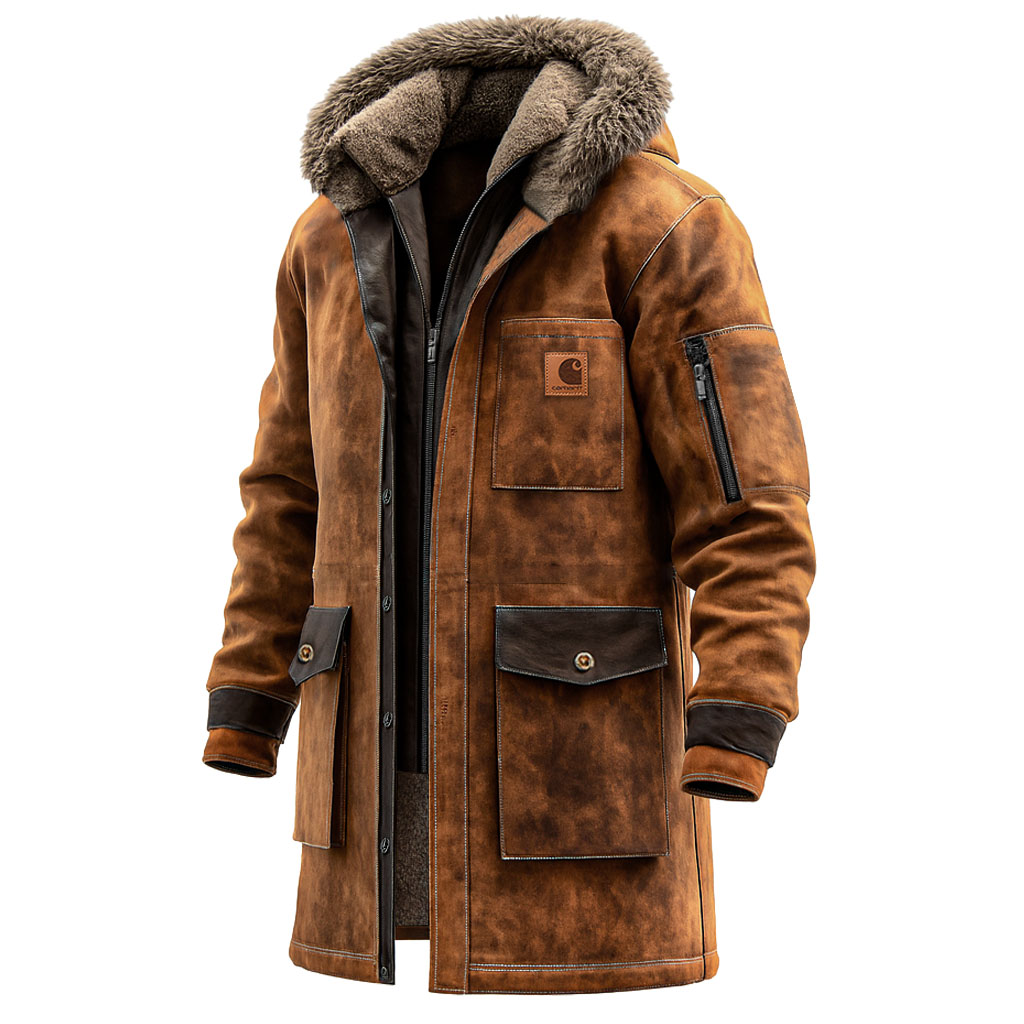 Men's Vintage Brown Suede Color-Block Multiple Pockets Double-Collar Stand Collar Fleece Hooded Jacket Coat