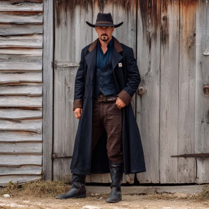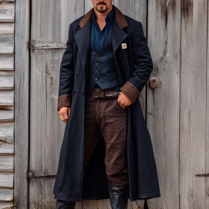 Men's Vintage Western Cowboy Dark Blue Contrast Long Trench Coat