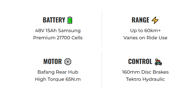 Powered by a punchy Bafang high-torque 65Nm motor, the Riptide 3 effortlessly cruises across beaches, suburbs, and streets. The removable 15Ah battery, built with Samsung 21700 cells, delivers up to 60km of range on a single charge, providing ample power for long adventures.