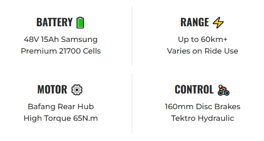 Powered by a punchy Bafang high-torque 65Nm motor, the Riptide 3 effortlessly cruises across beaches, suburbs, and streets. The removable 15Ah battery, built with Samsung 21700 cells, delivers up to 60km of range on a single charge, providing ample power for long adventures.
