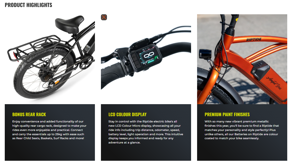 The Riptide 3 Electric Beach Cruiser is your ultimate ride for summer adventures. Featuring sleek yet chunky 26x3.0” street tyres and multiple premium colour options, it combines style with functionality. Available in both step over and “S” step-through frame designs, this cruiser seamlessly blends a relaxed beach vibe with versatility. The included cargo rack allows for easy customisation, accommodating child seats, surf racks, baskets and bike trailers.